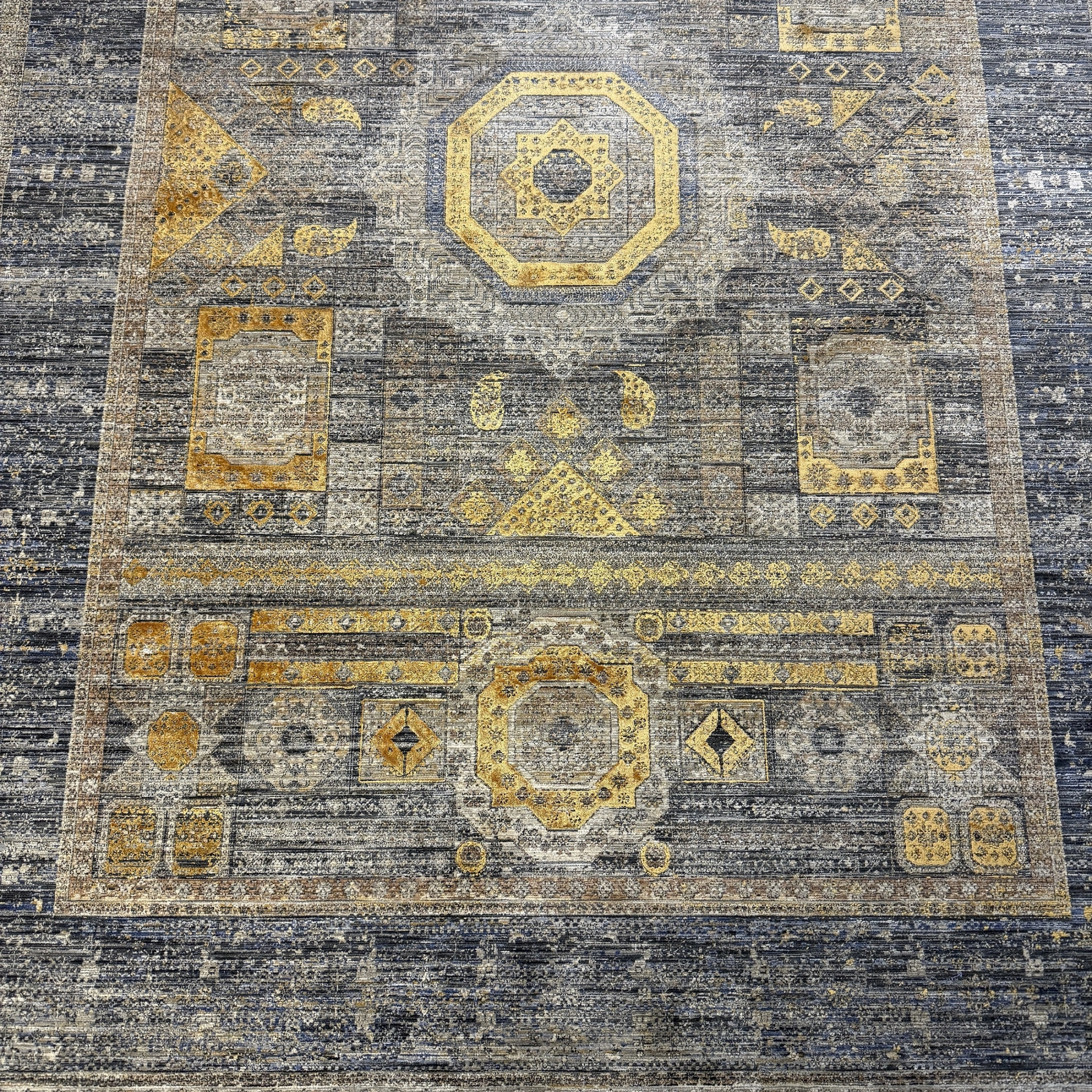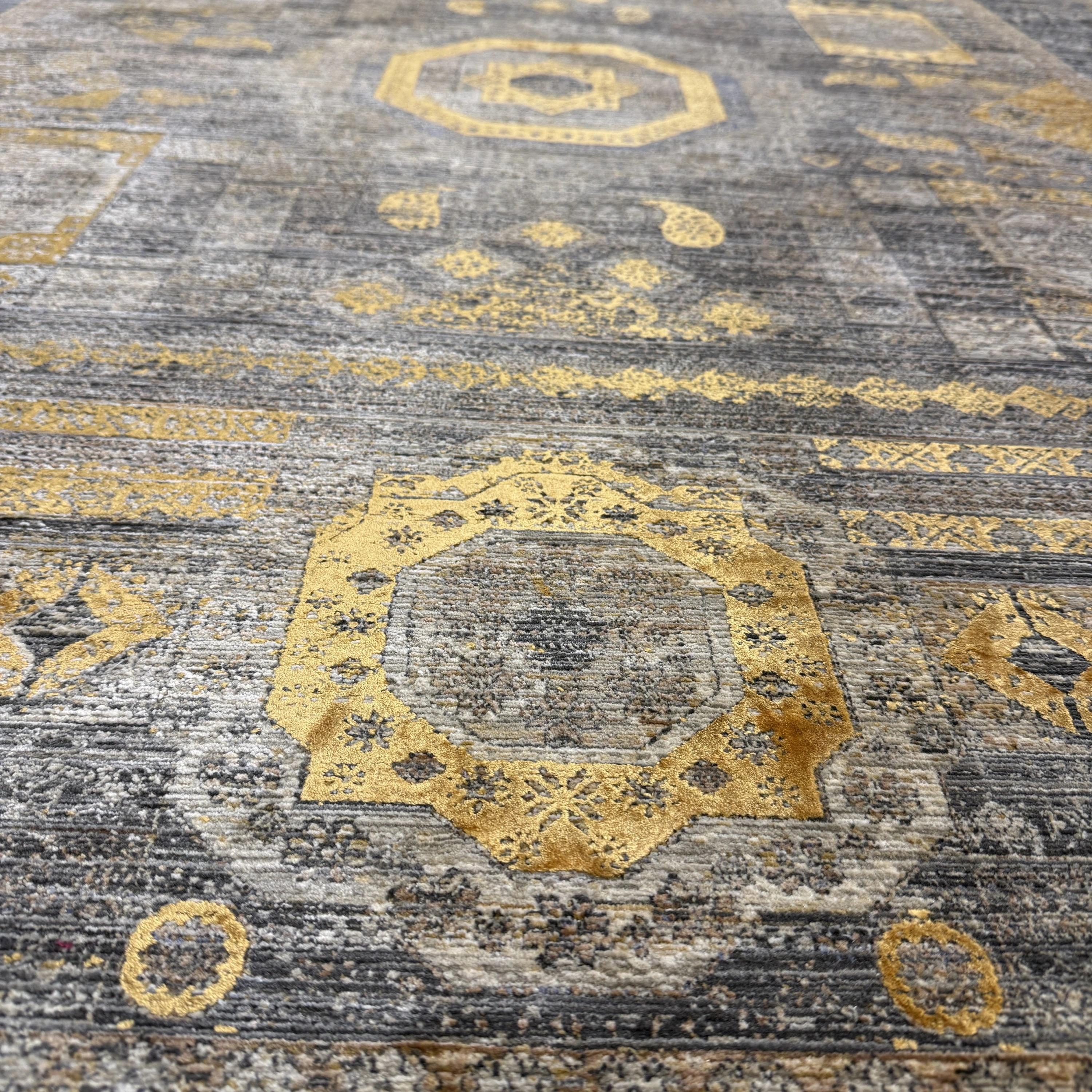 Modern dekorasyonu tamamlayan şık detaylara sahip yüksek–alçak dokulu modern salon halısı, polyester ve viskon iplik karışımıyla üretilerek hem dayanıklılığı hem de ipeksi dokuyu bir arada sunar. Sık dokuma yapısı sayesinde uzun ömürlü kullanım sağlarken, hav vermeyen özel üretim teknolojisi ile günlük kullanım için idealdir.